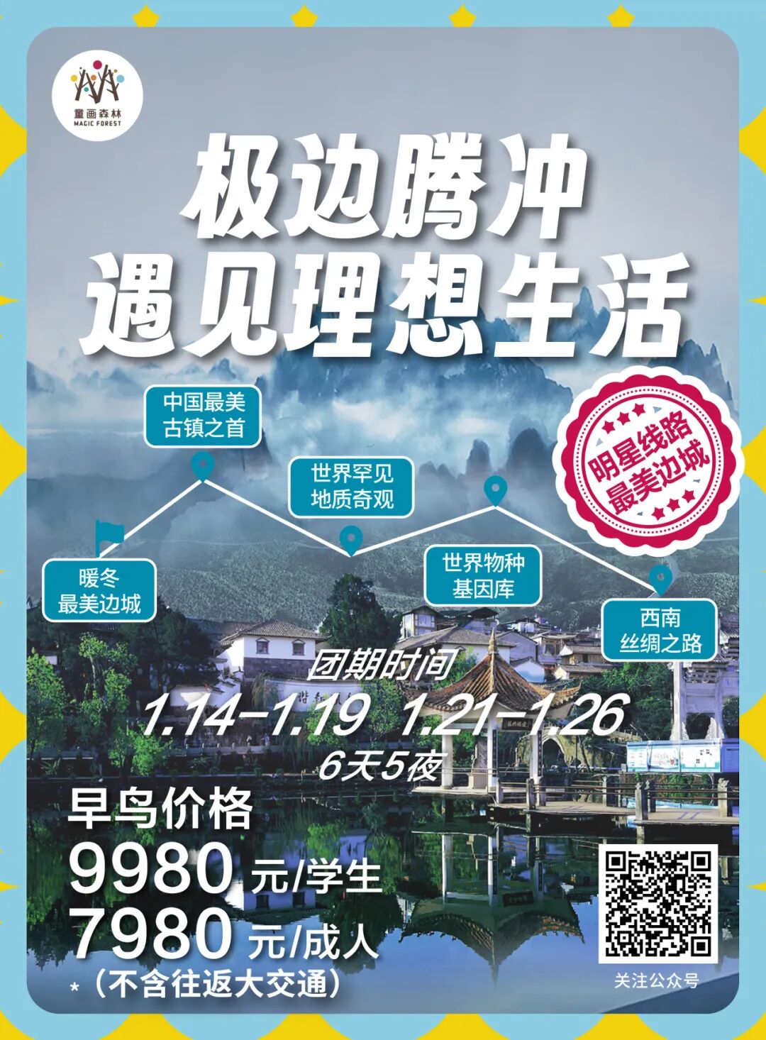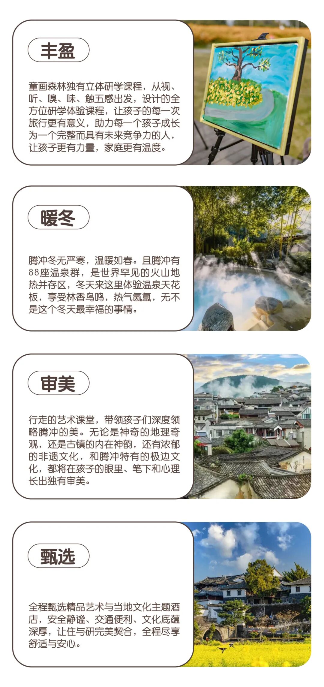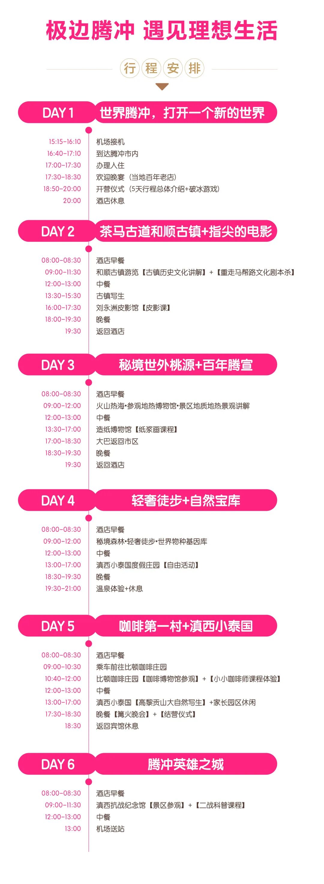 2025寒假|极边腾冲,遇见理想生活腾冲,从仙境坠落的地方 《国家地理》推荐一生必去的小镇 徐霞客记忆中最美的“极边第一城” 这里有一座世界名山——高黎贡山 有一个世界罕见的地质奇观——火山热海 有一条古往今来的通道——西南丝绸之路 有一段断气回肠的滇西抗战史 一个人的丽江,两个人的大理,一家人的腾冲 带上家人,带上好奇 跟随童画森林的专业领队 一起探索未知的世界 ![]() ![]() ![]() 快来跟上 童画森林的专业研学导师 即刻出发,去最美边城 度假&研学两不误 ![]() ![]() 【行程亮点】 ![]() ![]() 【核心研学内容】 01 西南古丝绸之路的必经之地,中国古代建筑活化石 ![]() 漫步在古朴、干净的青石板小巷,像走在古镇的每一条叶脉上,气派的牌坊、典雅的月台、亭阁,一栋栋明清的徽派建筑,在古树的掩映下更显厚重。这些古式建筑中,有的十分巧妙地加入了异域的元素,欧式的窗户、南亚的大门,与中式的四合五天井、三房一照壁融为一体,彰显出侨乡多元文化的的交融。 课程与活动 Course & Activities 腾 冲 ⭐《古镇历史文化讲解》 ⭐《重走马帮路文化剧本杀》 ⭐《明清古建筑写生》 02 静看一场皮影,体味一生的坚守 ![]() 作为腾冲市固东镇刘家寨皮影戏的第四代传人,他年逾古稀却仍然活跃在皮影制作、演出的第一线。与年逾古稀的非遗传承人刘永周来一场腾冲独有的3D皮影艺术与旅,感受一生坚守的匠心精神,体验科技+传统非遗文化的魅力。 课程与活动 Course & Activities 腾 冲 ⭐《传统灯影戏观赏》 ⭐《皮影制作与绘画》 ⭐《光影的故事之皮影表演》 03 天然地热博物馆,早在明清享有“一泓热海”的盛誉 ![]() 腾冲的地热资源丰富,有沸泉、气泉、温泉等,是中国三大地热区之一。热海尤其有名,徐霞客游记中对腾冲热海如此描述:“遥望峡中蒸腾之气,东西数处,郁然勃发,如浓烟卷雾,东濒大溪,西贯山峡”。 课程与活动 Course & Activities 腾 冲 ⭐《中国.腾冲地热地质博物馆讲解》 ⭐《温泉奇观寻宝》 04 是什么让他们300年匠心坚守? ![]() 在腾冲界头的很多村寨,至今仍保留着中国最古老的造纸手法,也就是手工抄纸技术。腾宣已传承300年,1941年,徐悲鸿从东南亚取道腾冲归国时,特意买了三卷滕宣纸。据说腾宣作画后别人无法偷揭。 课程与活动 Course & Activities 腾 冲 ⭐《古法造纸博物馆参观》 ⭐《当地居民家交流》 ⭐《纸浆画绘画》 05 在山水之间叩响被遗忘的人间秘境的大门 ![]() 徒步不是单纯的爬山走路,而是一种行走的自然教育。在深度接触大自然中,学会生存技巧,感受大自然的灵气,学会坚持和毅力。高黎贡山有记载的高等植物4800多种,国家重点保护动物80多种。轻徒5公里(根据体力可不全程参与),跟着护林员一起探索自然宝库,感受时光和自然的温度,静谧当中还有灵动,偶然回头,是大树杜鹃的壮丽,和小熊猫的挥舞。 课程与活动 Course & Activities 腾 冲 ⭐《徒步技巧学习与登山杖制作》 ⭐《沿途自然观察与讲解》 06 在小粒咖啡的发源地,唤醒咖啡原始的纯粹味道 ![]() 云南已有130年的咖啡种植历史,现已经成为了全国最大的咖啡产区,我们将前往中国咖啡第一村新寨古村,一个集咖啡文化和自然风光于一体的淳朴村落,在咖啡博物馆了解学习咖啡的前世今生。变身小咖农,从咖啡树成长过程到咖啡豆的采摘晾晒,从咖啡豆处理方式到咖啡的研磨冲泡,完整的体验咖啡制作全流程。 课程与活动 Course & Activities 腾 冲 ⭐《咖啡博物馆参观讲解》 ⭐《我是小咖农之咖啡课程体验》 07 走进高黎贡山脚下,探秘藏在潞江坝的世外桃源 ![]() 在每个久居都市的人心中,都希望有一处属于自己的世外桃源,就像宫崎骏笔下的世界一样,干净美好,舒适宜人。高黎贡勐赫小镇,就是一座藏在潞江坝的世外桃源,它背靠“世界物种基因库”之称的高黎贡山,依存怒江。寒假,我们将在这里遇见最美的春天,古树鲜花绿草尽收眼底,感受勐赫的民族风情。 课程与活动 Course & Activities 腾 冲 ⭐《自由休闲度假》 ⭐《高黎贡山大自然风景写生》 ⭐《天然温泉体验》 ⭐《傣族篝火晚会》 ⭐《结营仪式》 08 聆听抗战文化,全观边城腾冲 ![]() 这是一段到了现场才能听到的历史。腾冲作为“滇西抗战”的主战场之一,可谓“一寸山河一寸血”。滇西抗战纪念馆为我们详实地记录了滇西印抗战史实,踏进纪念馆,聆听腾冲抗战文化,了解那一段血与火的悲壮历史,从另一个视角看边城文化,把爱的种子种植在孩子的心灵深处。 课程与活动 Course & Activities 腾 冲 ⭐《二战科普课程》 ![]() ![]() 当地特色餐厅,寻味最地道腾冲美食 ![]() ![]() ![]() 比顿咖啡餐:当地小粒种咖啡与菜肴相结合,每一道菜里都由浓郁的咖啡因素,从咖啡叶到咖啡花,在品尝美味的同时还能通神、助眠。 ![]() ![]() 马帮大院:充满浓厚马帮文化的大院式餐厅,坐落在院内用餐,仿佛置身300年的马帮历史当中,一个个鲜活的人物从旁穿越,品尝马帮特色荞麦饼,尝试一口马帮油炸零碎,在遥远的路也挡不住故乡的温柔。 ![]() ![]() 茶博园餐厅:高黎贡茶餐厅,所有配菜和米饭均是用茶叶蒸煮,茶叶的清香弥漫着菜肴的味道,一碗一筷都有悠闲的味道。 ![]() ![]() 乡村小花园:当地网红餐厅,仅仅是步入大门,就能感受到花园的味道,古色古香的亭台楼阁,错落有致的花卉盆栽,当地特色的稀豆粉、鹅油拌饭,每一帧都让人回味