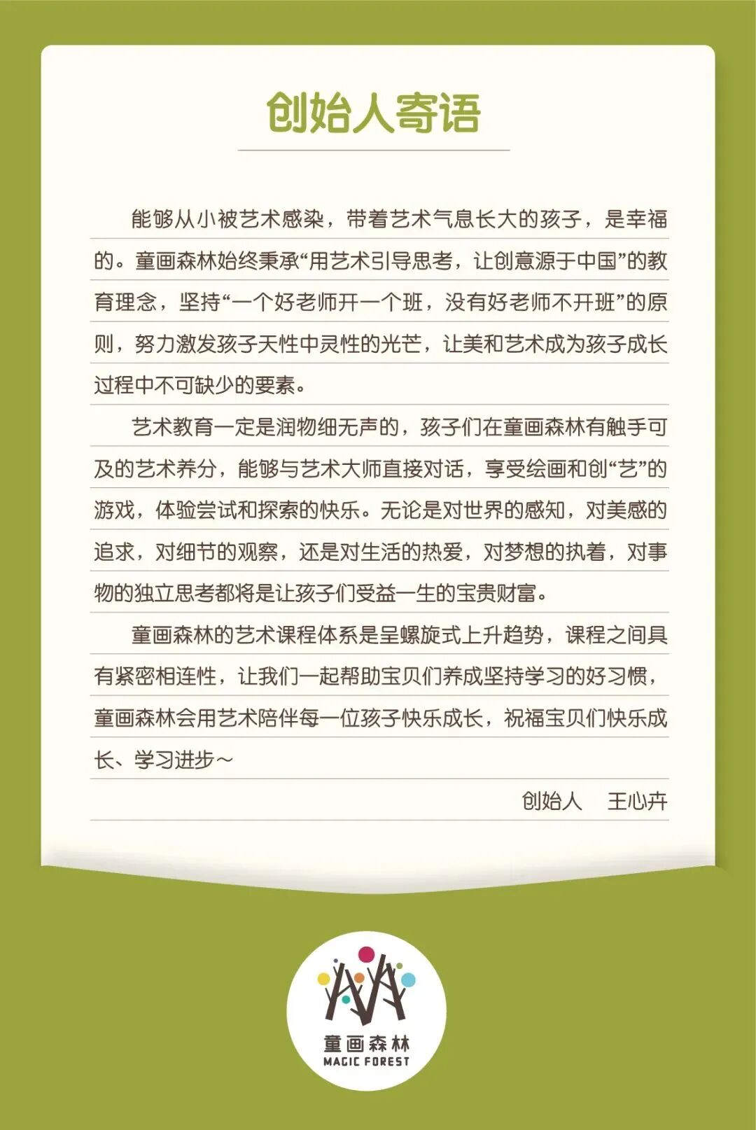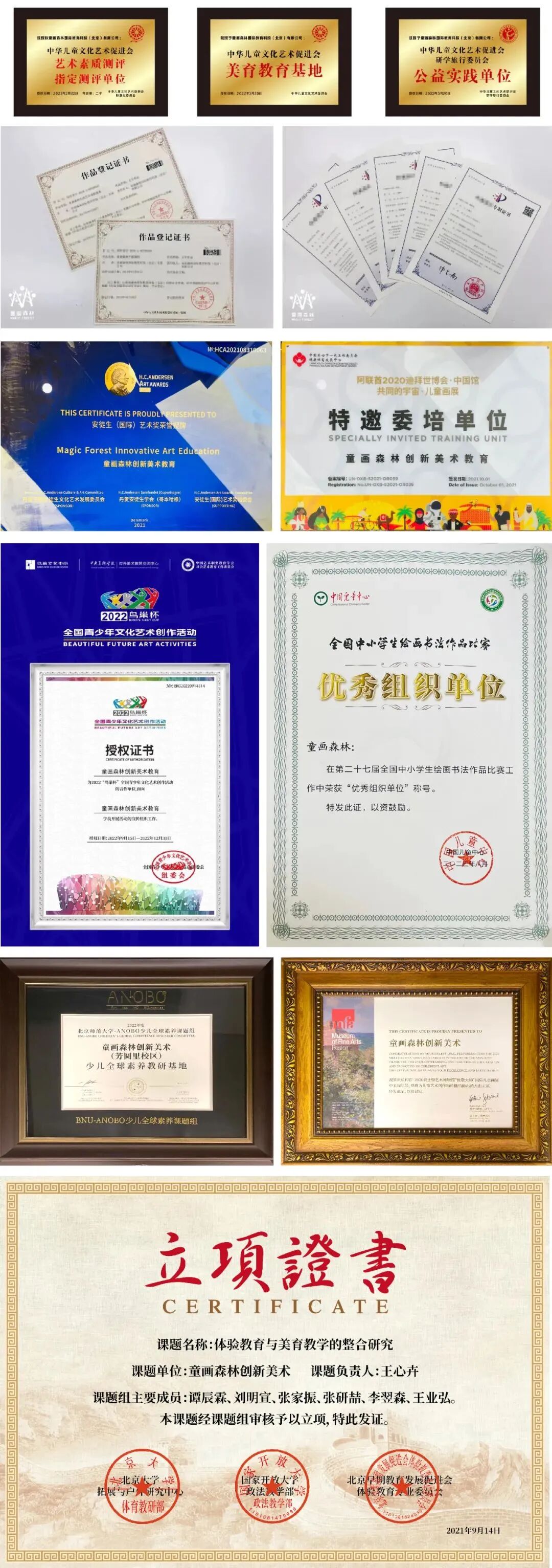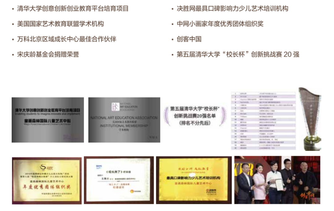 【童画森林】全球首家“美术+书法+研学”教育品牌![]() 1 认识童画森林 专注2-18岁“美术+书法+研学” 创新儿童美术教育品牌 清华大学“创意创新创业”教育平台培育项目, “美国国家艺术教育联盟”学术机构。 11年儿童艺术教育办学经验, 北京一线名师资源, 对标中、美、芬三国艺术课程标准, 小班分龄浸入式教学课堂, “线上+线下”互补交叉, 给孩子完整的学习闭环。 在全国城市设立了19家直营校区, 陪伴几万名儿童艺术成长。 ![]() 童画森林教育理念 ![]() 用艺术引导思考,让创意源于中国 跨学科教育、个性化学习、终身学习 2 教学特色 ![]() 童画森林整体教学优势 ![]() ![]() ![]() 完整教学闭环,线上线下互补 ![]() “线上+线下”结合,完整的学习闭环, 陪伴孩子扎实走好每一步 ![]() ![]() 自主研发,专利课程,系统学习 ![]() 对标“中、美、芬”三国艺术课标, 纳入清华大学教育培育重点项目 ![]() 自主研发专利课程体系 ![]() ![]() “螺旋式+阶梯式”上升教学规划 ![]() 小班制分龄教学,浸入式课堂,融入式引导 线下2-18岁儿童课程阶梯 ![]() 线上4-18岁儿童课程阶梯 ![]() 3 教学环境 ![]() 浸入式艺术实体课堂 ![]() 小班教学,首都名师面对面 绘画材料丰富,环创艺术氛围浓烈 课前准备、课堂创作、课后作业完整闭环 日系+北欧装饰风格,“少即是多”的理念 国家设计专利教室,绿、白、木色设计风格 模拟天光留白设计,护眼且不限制孩子想象力 ![]() ![]() ![]() ![]() ![]() ![]() ![]() ![]() ![]() ![]() 生动有趣的直播课堂 ![]() 专利课程全球直播,深入学术交流 小班教学,实时屏幕共享透明课堂 首都名师面对面,随时语音点评互动 引导语言生动活泼,教具创意创新 教学氛围更融洽,孩子学习更投入 ![]() ![]() 4 品牌资质 童画森林11年的办学沉淀积累, 得到了社会、国家和业界的认可, 获得如下殊荣。 ![]() ![]() ![]() 5 学员成果 ![]() 童画森林学员荣誉证书 ![]() 童画森林的学员在老师的指导下, 取得国内、国际艺术界证书, 这是学员学习成果的体现, 也是童画森林艺术教育质量的肯定。 ![]() ![]() ![]() ![]() ![]() ![]() ![]() ![]() ![]() ![]() 童画森林学员作品 ![]() 创意创新材料丰富, 艺术学科知识同步, 提升孩子审美力与自信心 ![]() ![]() ![]() ![]() ![]() ![]() ![]() ![]() ![]() ![]() ![]() 童画森林儿童公益画展 ![]() 画展是小小艺术家的艺术殿堂, 在这里孩子们用画笔和奇思妙想向世界发声 ![]() ![]() ![]() ![]() ![]() ![]() ![]() ![]() 2024“Art is us”下半年教学汇报展 ![]() ![]() ![]() ![]() ![]() ![]() ![]() ![]() 2024无限想象上半年教学汇报展 ![]() ![]() ![]() ![]() ![]() ![]() 2023年“艺游@未来”公益主题画展 ![]() ![]() ![]() 2022年“一滴水一世界”世界少儿科技艺术巡展 ![]() ![]() ![]() ![]() ![]() ![]() 2021年公益1帮1儿童画展 ![]() 2019年"水3"儿童公益画展现场 ![]() 2018年"Art is Us"儿童公益画展现场 ![]() 2017年“Little She,Little He”儿童公益画展现场 6 学员花絮 ![]() 童画森林线下平面课 ![]() 童画森林参照中、美、芬艺术国标, 遵从儿童绘画发展期特点, 经由专业的教研团队及 清华大学美术学院的专家教授共同研发, 制定出一套适合 2-18岁青少年儿童的专业课程。 ![]() ![]() ![]() 童画森林户外写生 ![]() 在亲近大自然和人文建筑的同时, 最大限度地激发孩子艺术创造潜能, 提高孩子的环境适应能力、注意力、 感受美和鉴定美的能力。 ![]() ![]() ![]() ![]() ![]() ![]() ![]() 童画森林博物馆课 ![]() 在博物馆,美术馆, 更近距离地拥抱艺术变幻无穷、 巧思妙多的无限创意和展现。 ![]() ![]() ![]() ![]() ![]() ![]() ![]() 童画森林书法课程 ![]() 通过硬笔书法的学习 孩子们不仅能够掌握书写技巧 还能在字里行间感受到中华文化的博大精深 进一步激发他们对艺术的兴趣和热爱 ![]() ![]() ![]() ![]() ![]() ![]() ![]() ![]() ![]() ![]() 童画森林假期艺术营 ![]() 通过不同门类艺术课程的学习, 了解中外丰富的艺术形式, 培养孩子的综合实践能力, 拓展孩子们的艺术视野 并提高对艺术的鉴赏和审美能力。 ![]() ![]() ![]() ![]() ![]() 童画森林国内外艺术研学 ![]() 寓教于乐,寓教于行, 在走走停停的研学中, 领略国内外不同艺术领域大师的真实创作, 感受艺术之美, 更能在短期的团队生活中 锻炼孩子解决问题,表达沟通的能力。 ![]() ![]() ![]() ![]() ![]() ![]() ![]() ![]() ![]() ![]() ![]() ![]() ![]() ![]() ![]() ![]() 国内研学 ![]() ![]() ![]() ![]() ![]() ![]() ![]() ![]() ![]() ![]() ![]() ![]() ![]() ![]() ![]() ![]() ![]() 国外研学 ![]() 童画森林线上平面课 ![]() 童画森林线上直播、录播课程, 拓展了艺术学习方式, 丰富线下艺术课堂, 更深入探索艺术创作的乐趣。 ![]() 7 家长好评 童画森林努力激发 孩子天性中灵性的光芒, 让美和艺术成为孩子成长过程中 不可缺少的要素, 希望把最优质的教育 带给全球每一个家庭, 用艺术与爱陪伴每个孩子快乐成长。 在这期间, 我们陆续收到了不少家长的评价, 我们一起聆听来自家长的内心的声音。 ![]() ![]() ![]() ![]() ![]() ![]() ![]() ![]() ![]() ![]() 8 童画森林衍生品 童画森林自成立之初就确立了 “做儿童行业的多元化品牌”的长期愿景。 儿童艺术教育是我们的起点, 同时也是领航点, 我们正在尝试着利用儿童教育行业的受众性, 逐步将产品及其衍生品推广到 服装、饰品、文具等其他儿童相关产业。 ![]() ![]() ![]() ![]() ![]() ![]() ![]() ![]() 童画森林国际儿