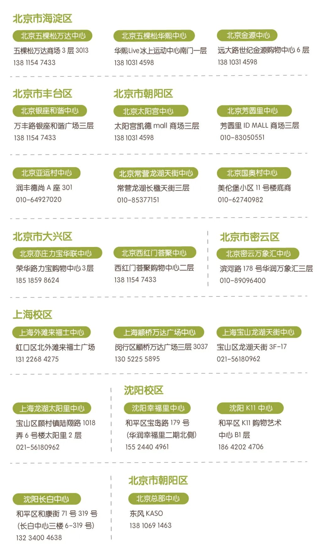 童画森林北京丰台银座和谐广场中心 北京市丰台区万丰路银座和谐广场3层 010-63307981 童画森林北京五棵松中心 北京市海淀区五棵松蓝色港湾购物中心3层 010-88199768 童画森林北京密云中心 北京市密云区滨河路178号华润万象汇3层L330 010-89096400 童画森林北京常营龙湖天街中心 北京市朝阳区朝阳北路常营龙湖长楹天街3层 010-85377151 童画森林北京太阳宫中心 北京市朝阳区太阳宫凯德mall商场3层 010-84430006 童画森林北京亚运村中心 北京市朝阳区大屯北路华悦国际G座601室 010-58277322 童画森林北京国奥村中心 北京市朝阳区科荟路51号院美伦堡小区2号楼3单元101室 010-62740982 童画森林沈阳长白中心 沈阳市和平区宝岛路179号(华润幸福里二期北侧) 024-22526288 童画森林沈阳K11中心 沈阳市和平区K11购物艺术中心3层 024-66392868 童画森林上海宝山龙湖天街中心 上海市宝山区龙湖天街3F-17 021-56180980 童画森林上海颛桥万达广场中心 上海市都市路颛桥万达广场3层3038 021-34126280 童画森林总部 北京市朝阳区大屯北路润枫德尚写字楼B座 010-84925457 |