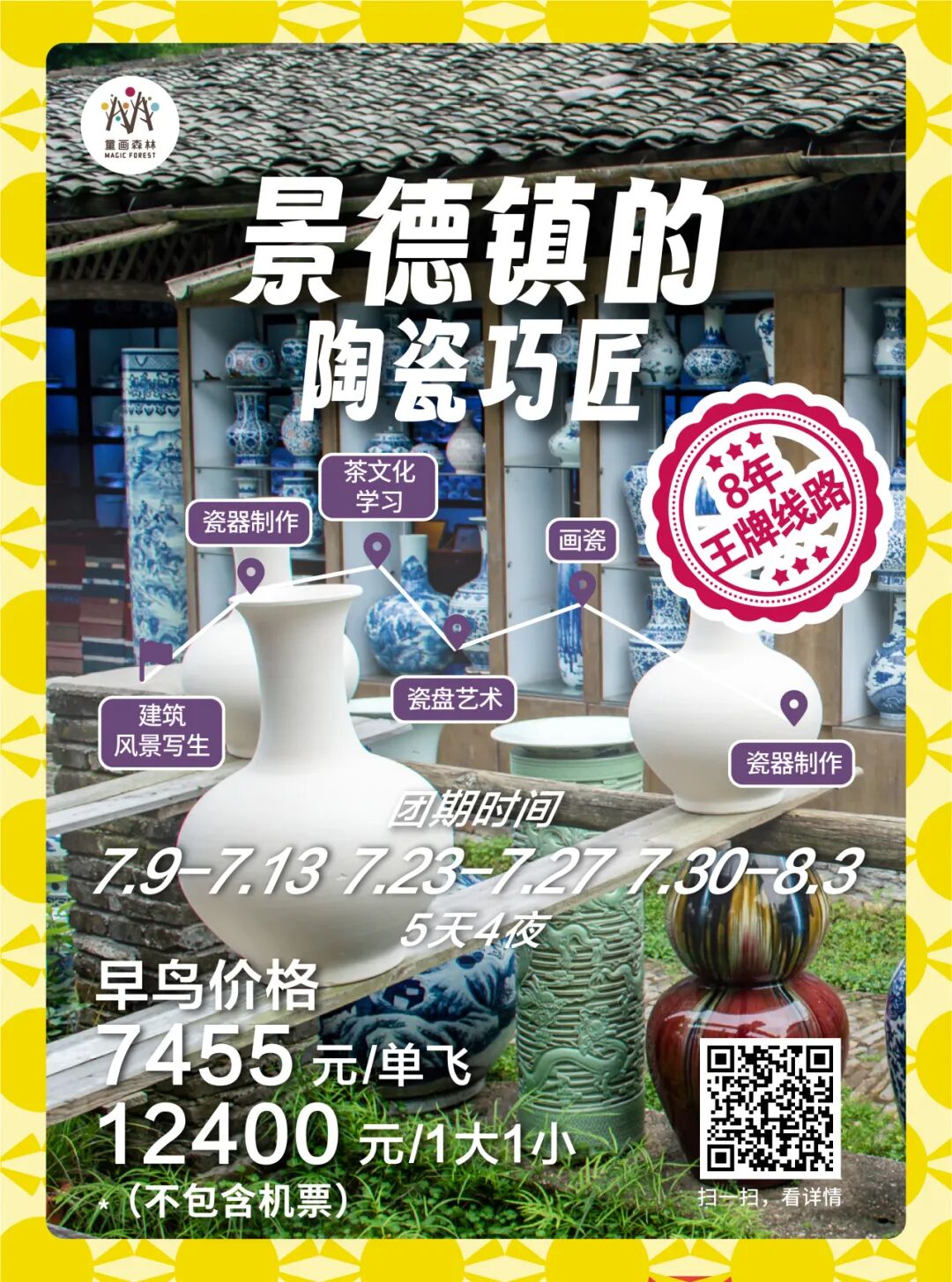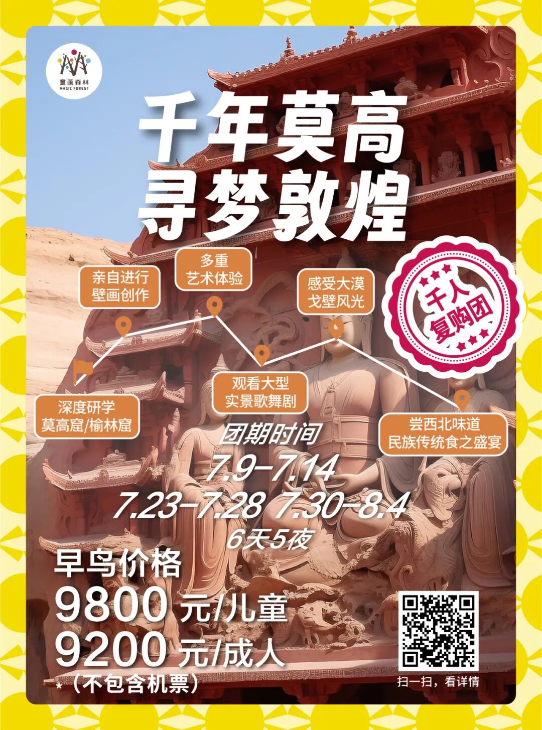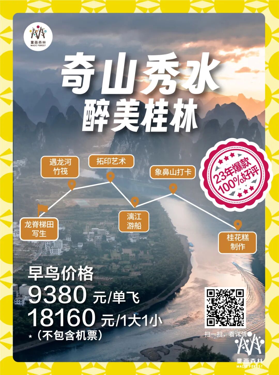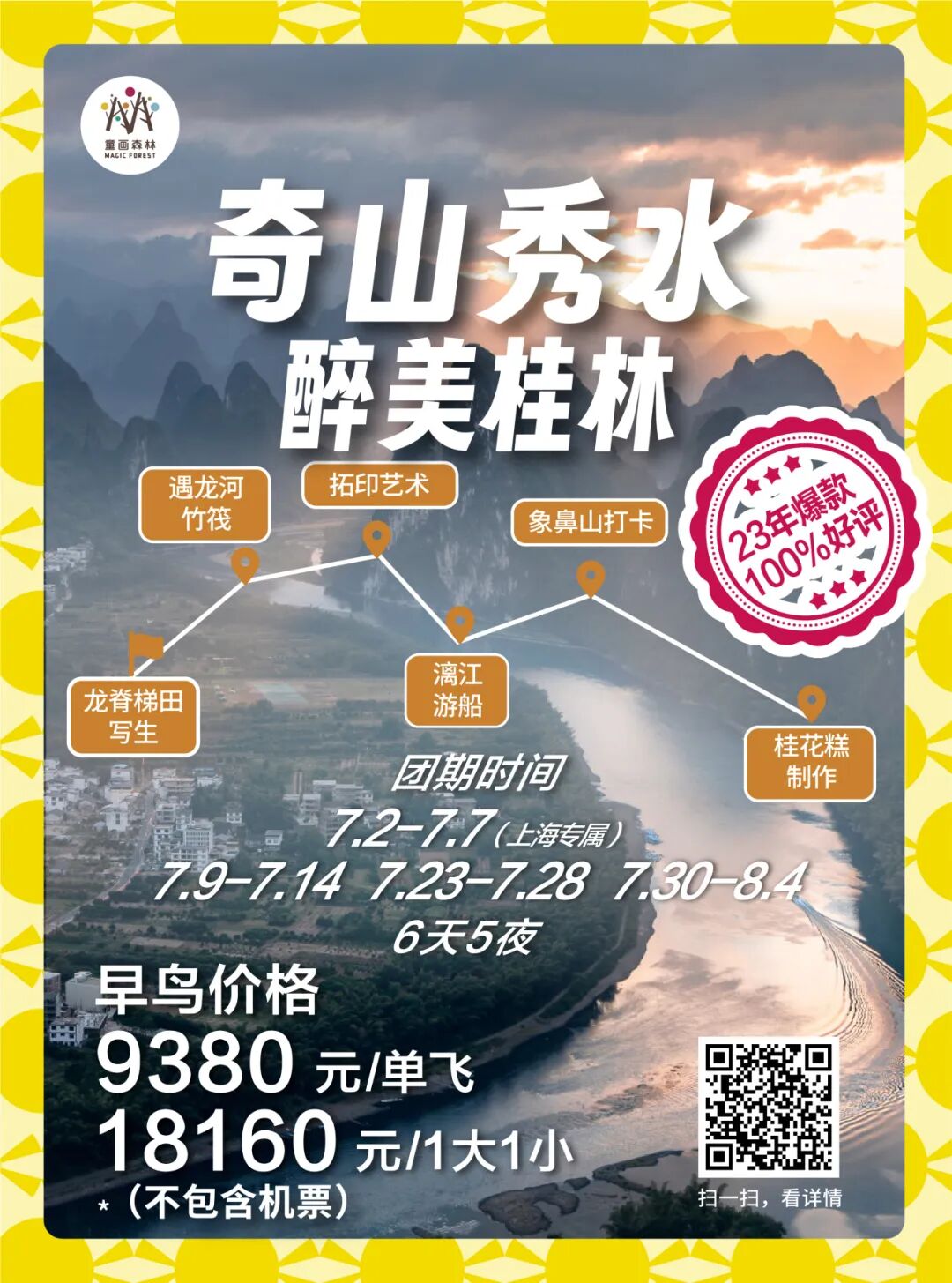 暑期研学回顾 | 桂林-镶嵌在碧水青山间的璀璨明珠漫步漓江之畔,感受“舟行碧波上,人在画中游”的诗意,学习喀斯特地貌的神奇形成,探索自然与人文的和谐共生。探访象鼻山、龙脊梯田等奇观,激发孩子们对大自然的无限好奇与敬畏之心。 ![]() ![]() ![]() ![]() ✦ + + PART-1 小画家集结日 MAGIC FOREST 桂林,作为一处集自然风光、民族文化与历史底蕴于一体的研学胜地,无疑是探索自然之美、体验农耕文化、感受民族风情的绝佳选择。 桂林龙脊梯田以其层层叠叠、规模宏大的梯田景观闻名遐迩,被誉为“大地最美指纹”。这里的梯田不仅夹在青山绿水之间,更添几分奇幻色彩。 站在梯田之巅,可以俯瞰到垂直起伏的梯田绵延数里,宛若山间巨龙的脊梁,震撼人心。 ![]() ![]() ![]() ![]() ![]() ![]() ![]() ![]() ![]() ![]() ![]() ![]() ✦ + + PART-2 赏民族风情 MAGIC FOREST 瑶寨保留了丰富的瑶族文化遗产,是了解瑶族历史、文化和民俗风情的绝佳窗口。在这里,学生们可以近距离观察瑶族的传统服饰、银饰和手工艺品,感受瑶族人民对美的追求和独特的创造力。 ![]() ![]() ![]() ![]() ![]() ![]() ✦ + + PART-3 桂北民俗体验 MAGIC FOREST 踏入芦笛岩的那一刻,仿佛穿越了时空的隧道,每一块钟乳石都在诉说着亿万年的故事。灯光下,钟乳石幻化成形态各异的景致,从“狮子回头”到“水晶宫”,每一处都让人叹为观止,感受自然与光影的完美结合。 ![]() ![]() ![]() ![]() ![]() ![]() ![]() ![]() 桂花公社不仅是一个观赏桂花的好去处,更是一个集研学、旅游、休闲购物为一体的全新文旅业态。景区内设有多个研学课程,如制作桂花糕、桂花香囊、桂花精油皂等DIY活动,以及研学课程如桂花种子培育、农田耕作体验等。这些课程不仅让学生们亲手体验传统工艺的魅力,还能在实践中培养动手能力、创新思维和团队协作能力。 ![]() ![]() ![]() ![]() ✦ + + PART-4 开启山水兴趣 MAGIC FOREST 这是一次将自然美景与知识学习完美融合的旅程 学生们可以聆听船夫讲述漓江的传说与故事,感受当地文化的深厚底蕴;还可以参与民俗活动,如观看渔民的传统捕鱼方式,亲身体验乡村生活的乐趣。 ![]() ![]() ![]() ![]() ![]() ✦ + + PART-5 沉浸山水 跃然纸上 MAGIC FOREST 在这个快节奏的世界里,我找到了一片静谧的桃花源——遇龙河竹筏游,仿佛穿越千年,邂逅了一场说走就走的古风之旅。 踏上轻盈的竹筏,随着碧波轻摇,两岸青山如黛,云雾缭绕,每一口呼吸都是自然的馈赠。山间清风徐来,水波不兴,心灵在这一刻得到了前所未有的洗涤和平静。 阳光透过树梢,洒在水面上,金光闪闪,如同无数颗星辰落入凡间,美得让人心醉。闭上眼,让这份宁静渗透每一个细胞,所有的烦恼似乎都随着流水远去。 ![]() ![]() ![]() ![]() ![]() ✦ + + PART-6 生活山水间 MAGIC FOREST 随着最后一缕夕阳温柔地洒在漓江水面,我的桂林研学之旅也缓缓落下了帷幕。这不仅仅是一段旅程的结束,更是知识与感悟的收获满满之时。 山水之间,我们收获了知识的宝藏,也留下了青春的足迹。感恩相遇,未来可期,这段旅程将成为心中最珍贵的记忆。 ![]() ![]() ![]() ✦ + + 研学亮点 吃、住、行、研 MAGIC FOREST 2024 美食体验 桂林,一个拥有丰富历史文化和自然景观的城市,其美食文化同样独具特色。 桂林米粉、阳朔啤酒鱼、荔浦芋头扣肉、阳朔竹筒饭,此外,桂林还有螺蛳粉、糍粑肉、白切鸡、扣肉糯米饭、酸辣粉、酸笋牛肉等众多美食等您来品尝。 ![]() ![]() ![]() 2024 舒适休息 童画森林秉承一贯的酒店定制标准,甄选五星标准酒店,让您和孩子在充实的旅程中,能够得到优质舒适的住宿体验。 ![]() ![]() 2024 轻松舒适 整日行程中,您将体验不同的交通方式,每一种方式都旨在增强您与这片土地的联系,使您的旅程更加生动和难忘。 ![]() 2024 艺术表达 您将在资深讲解员的带领下,深入洞窟内部,近距离观赏这些珍贵的壁画和彩塑。通过专业的讲解和生动的展示,亲手感受敦煌壁画的绘制过程,体验古代艺术家的匠心独运。 多种艺术风格,多元艺术材料,拓展孩子创造力,为孩子提供更多艺术表达方式。 ![]() 【艺术课程】《龙脊梯田写生课堂》 Art classes 课程知识点: ⭐ 世界农业文化遗产之一 ![]() 【艺术课程】《黄洛瑶寨》 Art classes 课程知识点: ⭐ 世界农业文化遗产之一 ![]() 【艺术课程】《艺术扎染》 Art classes 课程知识点: ⭐ 亲手体验传统非遗技艺 ![]() 【艺术课程】《遇龙河写生课堂》 Art classes 课程知识点: ⭐ 阳光下的色彩感受与表达 ✦ + + 往期桂林研学回顾 MAGIC FOREST ![]() 虽然研学之旅已经结束,但学习的脚步永不停歇。让我们带着在桂林收获的宝贵财富,继续前行,在未来的道路上绽放光彩 暑假团期 (7.23-7.28 7.30-8.4) ![]() 还有少量名额 赶快行动 联系老师报名吧 !!! 暑期更多精彩研学活动 等你来参加 ![]() ![]() ![]() ![]() ![]() ![]() ![]() ![]() ![]() ![]() ![]() ![]() 咨询答疑建议添加以下老师微信 ![]() 长按二维码 添加童画森林张老师 ![]() 长按二维码 童画森林马老师 ![]() 长按二维码 童画森林沈老师 电话联系 马老师:13611009680 沈老师:18618363312 张老师:15081685615 童画森林往期研学 MAGIC FOREST 童画森林,十九家直营校 11年品牌历史 400+营地导师 保证专业知识输出 60+优质主题研学线 丰富孩子人生体验 10+知识涉猎领域 保证多元视野 专注亲子研学、摩登父母游 ![]() ![]() ![]() ![]() ![]() ![]() ![]() ![](