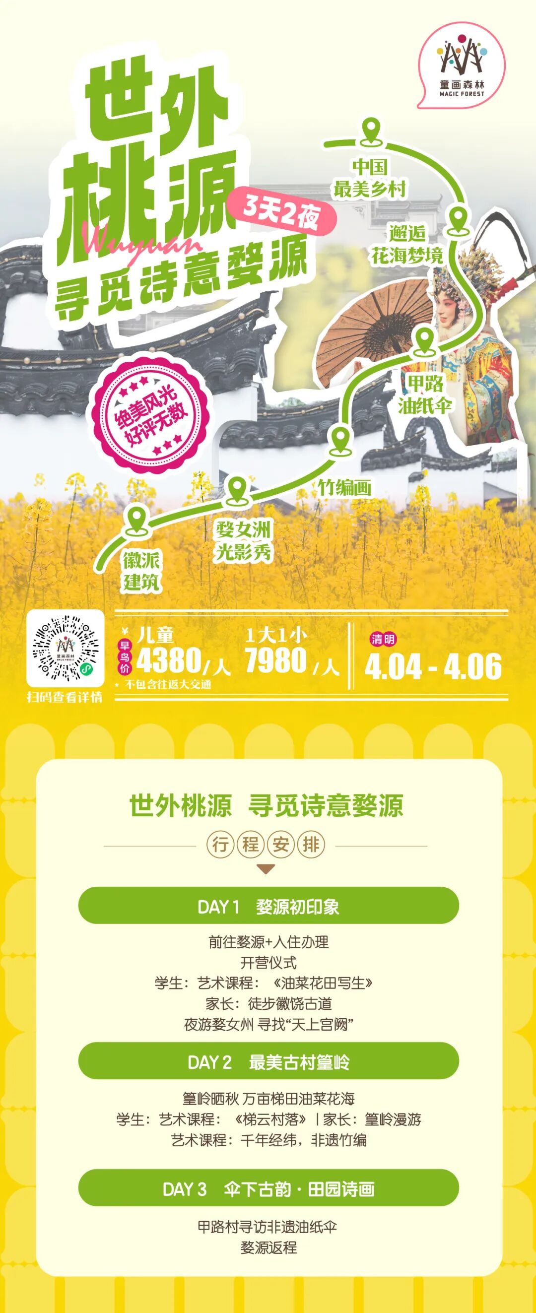 清明五一去哪儿玩?跟着课本去旅行之婺源实地调研:寻迹婺源,邂逅徽韵风华![]() ![]() 竹里馆——王维 独坐幽篁里,弹琴复长啸。 深林人不知,明月来相照。 ![]() ![]() ![]() ![]() “东风随春归,发我枝上花 。” 当新春的序章悄然奏响,婺源的山水便在这岁序更替中,满溢着诗意与期许。这片承载着千年徽文化的灵秀之地,如同一部厚重的史书,每一页都写满了岁月的故事。而我们,怀着对古老文化的敬仰与热忱,踏入这片土地,开启一场探寻徽韵风华的旅程,去揭开它神秘而迷人的面纱,邂逅甲路村油纸伞的古韵悠长,领略婺女洲的梦幻夜色。 “江碧鸟逾白,山青花欲燃”,婺源承载千年徽派文化,韵味悠长。首日探索的余韵未散,我们便满怀期待踏入第二天的旅程,走进艺术与自然、历史与现代交织的奇妙世界。篁岭的古村遗韵、古城写生的艺术碰撞、竹编技艺的匠心传承,以及巡检司油菜花田的烂漫春光与写生创作,都在等待着我们去深度探寻,解锁这片土地更多的精彩与感动。 ![]() ![]() ![]() ![]() 1 甲路村油纸伞 WUYUAN 2025 千年匠心,撑开古韵风华。 ![]() ![]() ![]() ![]() ![]() 走进甲路村,仿佛踏入了一个被时光遗忘的世界。这里的每一把油纸伞,都承载着八百多年的历史记忆。南宋时期,丞相马廷鸾将油纸伞带回甲路村,从此,这门制伞技艺便在这里生根发芽,代代相传。康熙年间,甲路纸伞被列入《婺源县志》“货属篇”,并随着徽商的脚步,走向长江流域,成为中国传统工艺文化的活化石。 ![]() ![]() ![]() ![]() ![]() 甲路油纸伞的制作工艺堪称一绝。采用优质木竹、皮纸、桐油以及柿树油等天然原料,历经七十二道半手工工序,每一道工序都倾注了匠人的心血与智慧。从选材、锯竹、刨青,到绘画、上桐油、结顶,每一步都需要精心操作,才能完成这把兼具实用与艺术价值的油纸伞。 ![]() ![]() ![]() ![]() ![]() 伞面上绘制的花鸟、仕女、风景等传统中国元素图案,色彩鲜艳而不失雅致,富含文化寓意,如多子多福、节节高升等,体现了中国传统文化中的美好祝愿。在传统民俗中,油纸伞还常被用作婚嫁用品,象征 “多子多福”,寓意婚姻美满、子孙满堂。如今,甲路油纸伞制作技艺已被列入国家级非物质文化遗产名录,它不仅是一件手工艺品,更是徽文化的生动体现。 2 婺女洲光影秀 WUYUAN 2025 光影交织,传颂古老传说。 ![]() ![]() ![]() 夜幕降临,我们来到了婺女洲。这里以婺女飞天传说为核心进行设计,充满了神秘的色彩。相传在尧帝时期,当地遭受大洪水,美貌且勇敢的婺女手持长矛,骑着大鳙鱼,逆流而上击退恶蛟,解救了村民,随后化作婺女星,永远守护着这片土地。 ![]() ![]() ![]() ![]() ![]() ![]() 在婺女洲,不仅能感受到传说的魅力,还能欣赏到新式徽派建筑的独特韵味。度假区融合古典与现代元素,粉墙黛瓦,小桥流水,一步一景,仿佛将古徽州的繁华与宁静都浓缩在了这里。金阁水幕光影秀、花船演艺、鱼灯巡游等精彩表演,让整个婺女洲的夜景璀璨夺目,极具浪漫氛围。此外,还可以观看以婺女飞天传说为背景的《遇见・婺源》,通过光影与实景结合,带来视觉与听觉的双重震撼。 3 篁岭 WUYUAN 2025 “中国最美乡村” ![]() 建村于明代的篁岭村是一座挂在山崖上,拥有600多年历史的徽派古山居村落,这里是徽商的重要发源地。千棵古树环绕、万亩油菜花海梯田,五彩缤纷的晒秋景观。 ![]() ![]() ![]() 被壮观花海梯田包围的白墙黑瓦古村落 直接美成语文课本封面,被誉为“全球最美十大梯田花海”之一,是令人惊艳的“大地艺术”。 每年的清明,由于海拔落差大、温度低,故而油菜花晚熟,被篁岭称为“婺源的最后一片油菜花海”。 偏于一隅的古村村民们保留着许多传统的习俗。由于“地无三尺平”,村民们会在屋顶木架上晾晒满了五彩斑斓的收获,形成了独特的“晒秋”景观,这一景观被评为“最美中国符号”。 ![]() ![]() ![]() 村落“天街”商铺林立,前店后坊,似玉带将经典古建串连。白墙黛瓦马头墙,飞檐戗角的古徽派建筑点映其间独具韵味。 ![]() ![]() ![]() 在这个时空折叠建筑群中,明代天街呈现「崖上古村」垂直聚落,18条巷弄形成天然取景框,白墙为面,黑瓦为线,油菜花汇点成面。在这里开始极致徽派美学的艺术绘画吧。 ![]() 《梯云村落》 艺术课程 艺术词汇:平面构成、画面形式感提炼 知识点: 1.学习如何提炼画面元素,构成画面 2.水彩写生技法 4 非遗竹编 WUYUAN 2025 千年经纬的当代解码。 ![]() ![]() ![]() 溯源南宋"徽州竹考"技艺依然传承在婺源村落之间。晨曦漫过北纬29°的竹海,在凌晨选取三年生毛竹,经破竹分层定宽制成的竹篾,在180℃的火焰中苏醒成流畅的弧线,经纬交织在月下生长成会呼吸的纹样,是竹与匠人跨越八百年的密语。 ![]() ![]() 老匠人常说"竹有七德",每道刮青的流光里,都凝着三十载春秋淬炼的透亮。 ![]() ![]() 童画森林的孩子也将体验这场和自然合作的创作,亲手编制属于自己的非遗竹编。 ![]() 《梯云村落》 艺术课程 艺术词汇:平面构成、画面形式感提炼 知识点: 1.学习如何提炼画面元素,构成画面 2.水彩写生技法 5 巡检司油菜花 WUYUAN 2025 绘就春日婺源的艺术诗篇。 ![]() ![]() ![]() ![]() 巡检司村位于婺源地处皖赣交界,自然资源优良,耕读文化厚重。是交通要道,明清时期设立的巡检司,负责地方治安,维护商道安全。这里看得见山、望得见水、记得住乡愁。这里