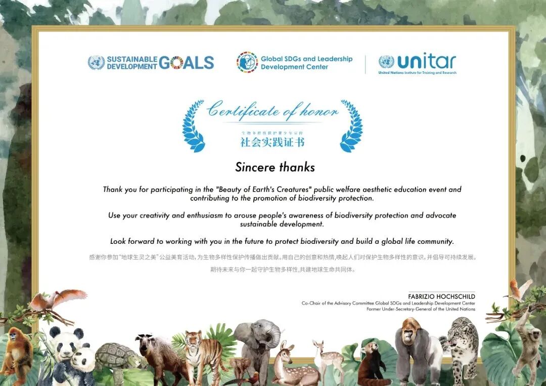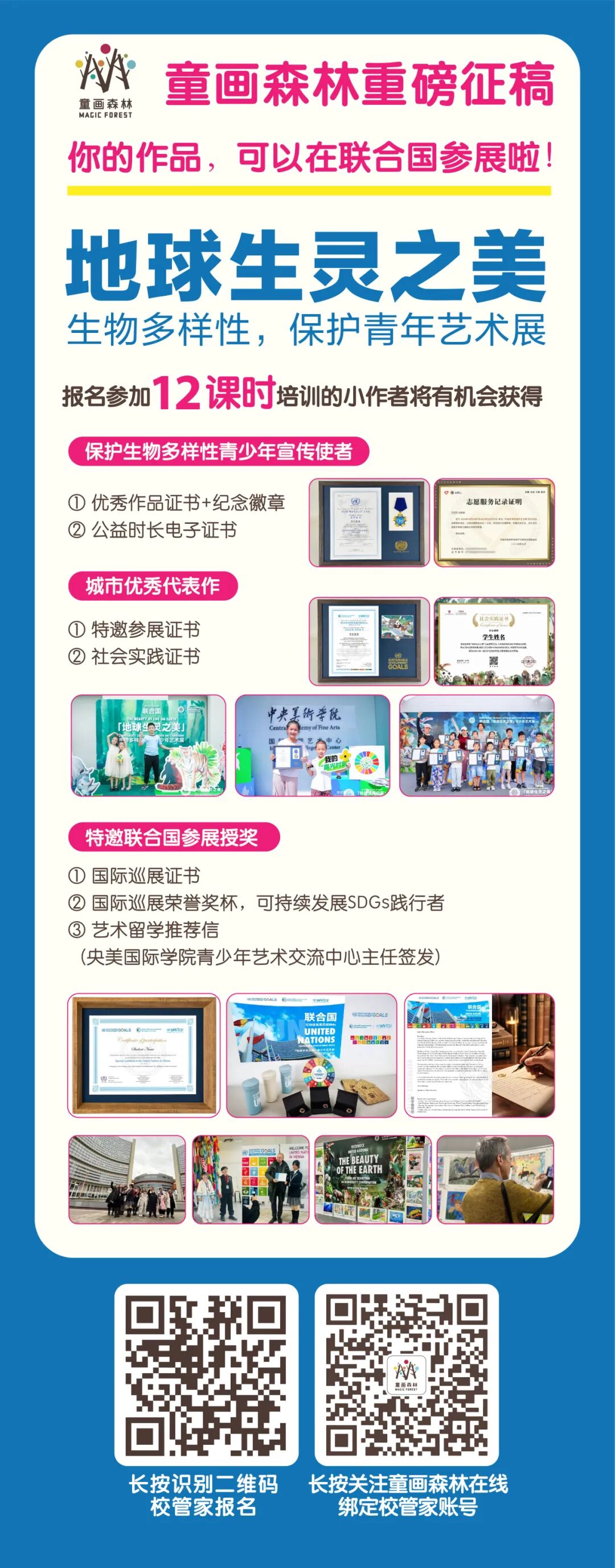 征稿 | 地球生灵之美&联合国(VIENNA)生物多样性保护青少年艺术展![]() 在联合国《2030年可持续发展议程》的指引下,本次活动由联合国可持续发展目标与领导力发展中心主办,联合国可持续发展目标与美育行为科学专委会承办,旨在通过艺术形式推动青少年对全球可持续发展目标的理解与实践。 全球青少年以画笔为纽带,共同谱写“地球生灵之美”可持续发展目标艺术篇章。特邀国际艺术家组成评审团优秀作品将亮相联合国展览。 本展响应联合国《生物多样性公约》及SDG 11(可持续城市)、SDG13(气候行动)、SDG14(水下生物)、SDG15(陆地生态)目标,通过艺术推动青少年参与全球生态治理。 加入我们,用艺术定义未来。 ![]() 赛事介绍 ![]() ![]() ![]() 联合国可持续发展目标与领导力发展中心(GlobalSustainable Development Goals and LeadershipDevelopment Center)即联合国训练研究所新加坡可持续发展目标中心(UNITAR SDGs Singapore Center),是首个面向亚太地区设立的专门机构,专注于推进联合国可持续发展目标的能力建设和人才培养。它的目标是成为亚太地区青年赋能和可持续发展的核心枢纽,全力推动联合国可持续发展目标(SDGs)的实现。 联合国训练研究所(UNITAR)是联合国系统内最高级别事务执行机构,总部位于瑞士日内瓦,于1963年由联合国大会决议成立,其主要承担联合国系统中的训练和研究两项核心职能,一直以来积极为发展中国家、国际组织、政府部门、企业和个人提供专业的能力建设和培训服务,在全球事务中发挥着关键作用。 ![]() ![]() ![]() 联合国妇女协会成立于1967年,是一个独立的非营利性组织,总部位于维也纳国际中心。其核心目标是通过教育、健康等领域的项目改善弱势妇女和儿童的生活:并通过慈善活动筹集资金支持全球公益项目。 地球生灵之美青少年画展项目 已被UNWG收录在官网公示 ![]() ![]() ![]() 守护“地球生灵之美” 四大主题创作 主题一:【万物共生·绿意盎然】 SDGs对应目标:15(陆地生物) 创作立意:呼应SDGs第15项“陆地生命”,唤醒青少年对生物多样性的敬畏之心。 主题二:【自然之美·大地生灵】 SDGs对应目标:13(气候行动) 创作立意:结合SDGs第13项“气候行动”,以艺术为濒危生命发声激发青少年成为“地球守护者 主题三:【蔚蓝星球·守护生态】 SDGs对应目标:14(水下生物) 创作立意:契合SDGs第14项“水下生物”,激励青少年用想象力推动海洋可持续保护。 主题四:【地球印记·持续未来】 SDGs对应目标:11(可持续城市) 创作立意:呼应SDGs第11项“可持续发展城市和社区”,传递“每个人的行动都是改变的力量”。 ![]() ![]() ![]() ![]() ![]() ![]() ![]() ![]() ![]() ![]() ![]() ![]() 1、参与对象: 全球4-18周岁青少年 3-6组/7-9组/10-12组/13-16组/16以上组 2、佳作展期: 2025年7月15日 提报截止日期:2025.5.31 3、作品类型 : 包括但不限于如下创意绘画、水墨画、水彩画、水粉画、油画蜡笔画、素描、卡通画、版画、漫画、综合绘画等。 4、作品尺寸:A3规格(297mm*420mm) 注:画作不接受立体画材,不接受木框装裱油画仅限帆布画,作品默认不退还。认证申请画作形式不限,电子版权默认同意组委会公益无偿调用。 5、评审维度说明 生态理念:物种多样性表现碳中和场景构建,SDGs映射目标15、13。 文化创新:文化传承融合度传统文化现代表达目标,SDGs映射11、16。 创作特色:情感表达 画面表现作品的创意和原创性,SDGs映射目标9、12。 情感共鸣:可持续发展青少年视角独特性,SDGs映射目标17、4。 ![]() ![]() ① 装裱荣誉证书+纪念徽章 ![]() ![]() ② 公益时长电子证书(1小时 需自行下载) ![]() ![]() ![]() ① 特邀参展证书 ![]() ② 社会实践证书 ![]() ![]() ![]() ① 国际巡展证书 ![]() ② 国际巡展荣誉奖杯,可持续发展SDGs践行者 ![]() ③ 艺术留学推荐信 (央美国际学院青少年艺术交流中心主任签发) ![]() ![]() ![]() ![]() ![]() ![]() ![]() ![]() ![]() ![]() ![]() ![]() ![]() 培训课时 12课时(包含4次培训,每次2小时) 北京五棵松万达、上海区域除外 培训时间 联系任课老师 ![]() ![]() ![]() 1、参展者所提交的作品必须由参与者本人创作或参与创作,并明确作品的著作权及版权,参展者应确认其作品的原创性,主办方不承担因作品侵犯他人(或单位)权利而产生的法律责任,其法律责任由参展者本人承担。 2、主办方对本次活动中评选的所有获奖作品拥有知识产权及版权,主办方享有对相应设计方案进行再设计、生产、展示、出版等权益。若作品在商业使用中其著作权存在争议,由提供作品的参展者承担法律责任。 3、主办方拥有对所有参与作品进行公益展示、报道、宣传的权利。 4、活动期间参展者不得将作品转让或许可给任何第三方,不得用参与作品参与其他与本赛事相同或类似的活动。 预祝小朋友们都能在地球生灵之美&联合国(VIENNA)生物多样性保护青少年艺术展比赛中取得优异的成绩哦! ![]() ![]() 扫码预约试听 欢迎来到童画森林 关注童画森林新媒体平台 获取更多精彩内容 Magic forest ![]() — 直营校区 — ![]()