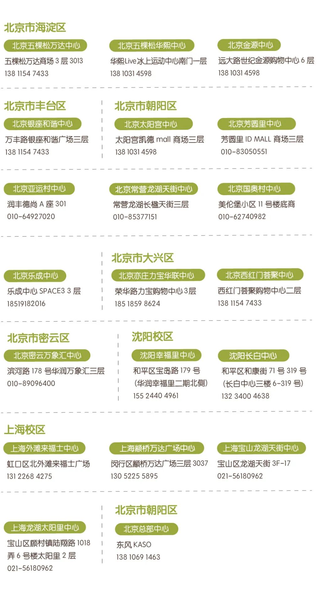 童画森林北京丰台银座和谐广场中心 北京市丰台区万丰路银座和谐广场3层 010-63307981 童画森林北京五棵松中心 北京市海淀区五棵松蓝色港湾购物中心3层 010-88199768 童画森林北京密云中心 北京市密云区滨河路178号华润万象汇3层L330 010-89096400 童画森林北京常营龙湖天街中心 北京市朝阳区朝阳北路常营龙湖长楹天街3层 010-85377151 童画森林北京太阳宫中心 北京市朝阳区太阳宫凯德mall商场3层 010-84430006 童画森林北京亚运村中心 北京市朝阳区大屯北路华悦国际G座601室 010-58277322 童画森林北京国奥村中心 北京市朝阳区科荟路51号院美伦堡小区2号楼3单元101室 010-62740982 童画森林沈阳长白中心 沈阳市和平区宝岛路179号(华润幸福里二期北侧) 024-22526288 童画森林沈阳K11中心 沈阳市和平区K11购物艺术中心3层 024-66392868 童画森林上海宝山龙湖天街中心 上海市宝山区龙湖天街3F-17 021-56180980 童画森林上海颛桥万达广场中心 上海市都市路颛桥万达广场3层3038 021-34126280 童画森林总部 北京市朝阳区大屯北路润枫德尚写字楼B座 010-84925457 |