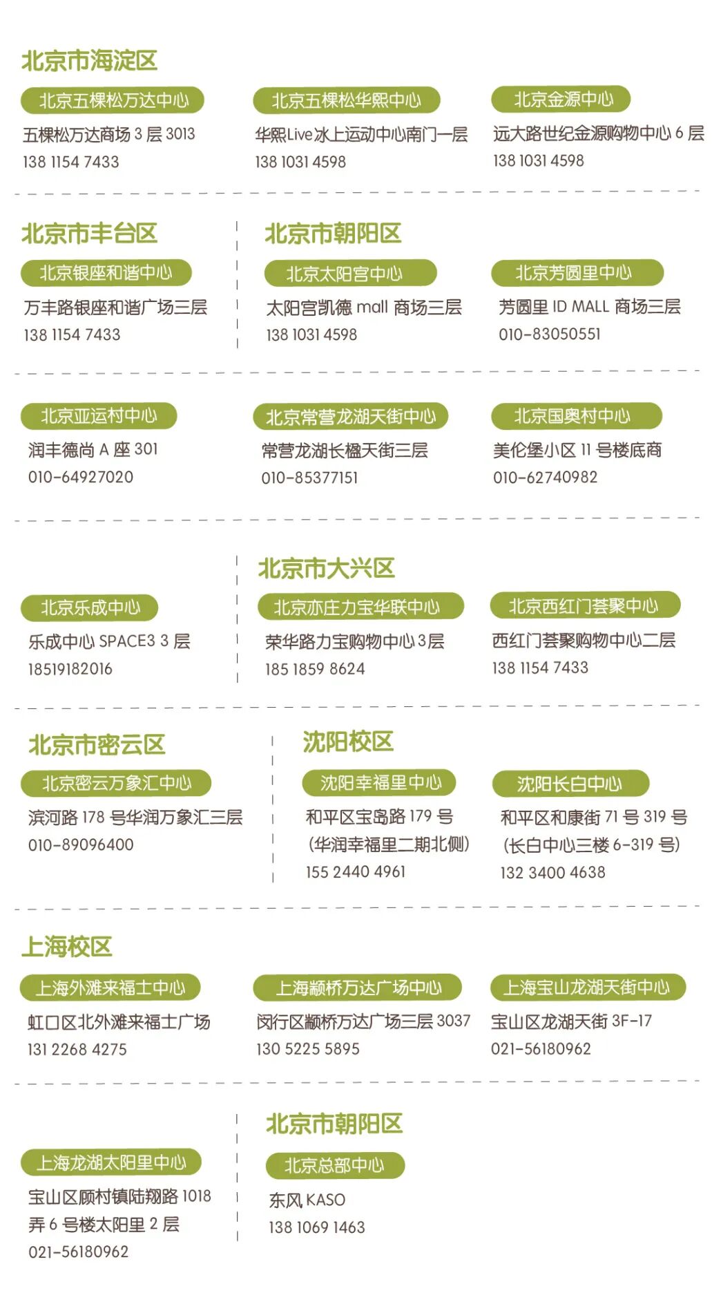 童画森林北京丰台银座和谐广场中心 北京市丰台区万丰路银座和谐广场3层 010-63307981 童画森林北京五棵松中心 北京市海淀区五棵松蓝色港湾购物中心3层 010-88199768 童画森林北京密云中心 北京市密云区滨河路178号华润万象汇3层L330 010-89096400 童画森林北京常营龙湖天街中心 北京市朝阳区朝阳北路常营龙湖长楹天街3层 010-85377151 童画森林北京太阳宫中心 北京市朝阳区太阳宫凯德mall商场3层 010-84430006 童画森林北京亚运村中心 北京市朝阳区大屯北路华悦国际G座601室 010-58277322 童画森林北京国奥村中心 北京市朝阳区科荟路51号院美伦堡小区2号楼3单元101室 010-62740982 童画森林沈阳长白中心 沈阳市和平区宝岛路179号(华润幸福里二期北侧) 024-22526288 童画森林沈阳K11中心 沈阳市和平区K11购物艺术中心3层 024-66392868 童画森林上海宝山龙湖天街中心 上海市宝山区龙湖天街3F-17 021-56180980 童画森林上海颛桥万达广场中心 上海市都市路颛桥万达广场3层3038 021-34126280 童画森林总部 北京市朝阳区大屯北路润枫德尚写字楼B座 010-84925457 |